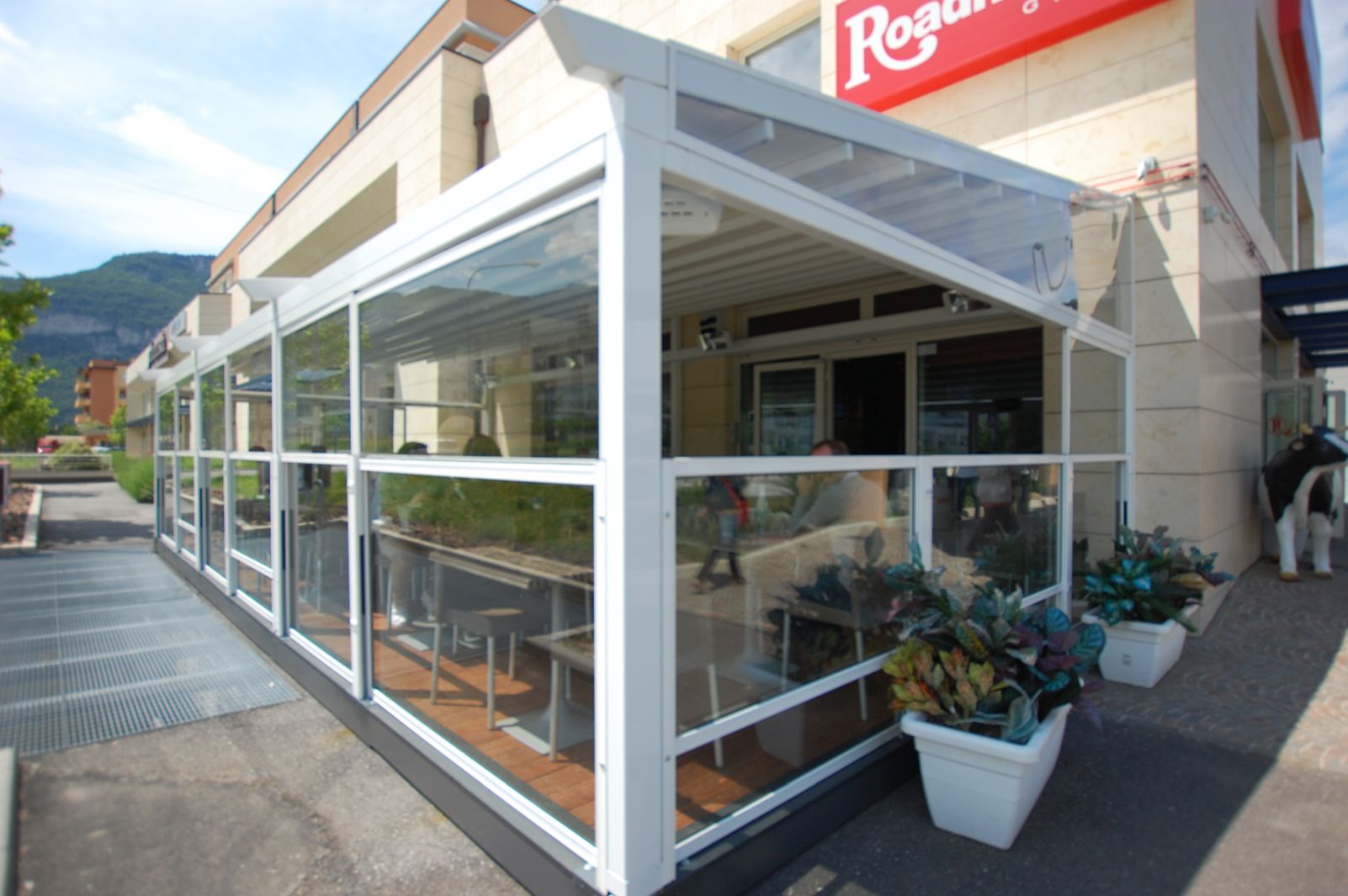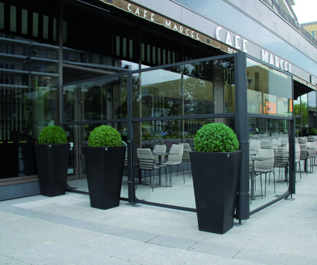 Structure modulaire avec mouvement Up&Down semi-automatique pour ouvrir et fermer l’espace extérieur selon les besoins, avec possibilité de positionnement intermédiaire.