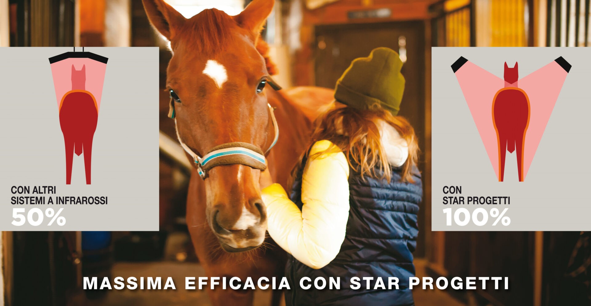 Les chauffages de Star Progetti réduisent le besoin de couvrir, favorisent la santé et améliorent l’état de la peau et du pelage du cheval. L’infrarouge de nos appareils de chauffage est en mesure de détendre, de calmer et de fournir le confort thermique nécessaire au cheval. Ils peuvent être utilisés non seulement pour les chevaux malades et blessés, mais, en offrant de meilleures conditions thermiques, ils sont parfaits pour tous les chevaux, favorisant la santé et le bien-être.